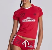 サイドラインショートパンツとTシャツのセットアップです!鮮やかなレッドカラーが目を引き、ストリートファッションに最適なアイテム。