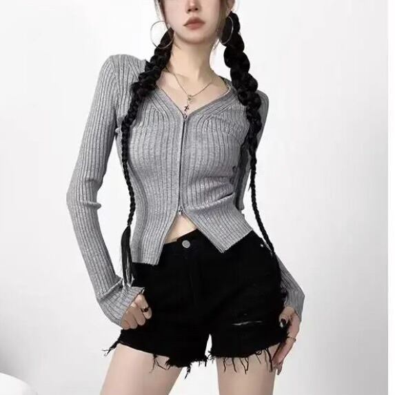 ダブルジッパーがポイントの、Vネックのショート丈ニットカーディガン。程よいフィット感で女性らしさを引き立て、長袖なのでオールシーズン使えるのも嬉しいポイント。