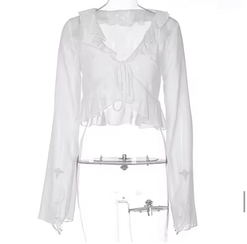 ショート丈シアーカーディガンは、軽やかな素材感とフリルデザインが特徴。デニムやスカートとの相性も抜群で、さまざまなコーディネートに取り入れていただけます。